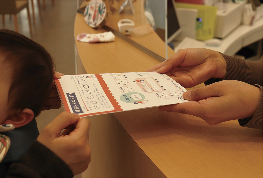 「お医者さんと保護者のコミュニケーション密度を上げる研究」をテーマとし初回受診に訪れた便秘の症状を持つお子さんの保護者に渡す冊子と日記の制作。事前に便秘について知ることができるほか、毎日の便に関する記録とともに、「相談したいこと」をメモすることでコミュニケーションのきっかけとなり、スムーズにニーズを発見できるツールです。現在、エールホームクリニックさんにて実際に使用していただいています。